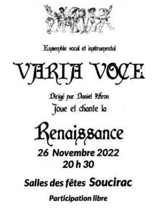 Le groupe vocal et instrumental « Chœur de femmes Varia Voce » , dirigé par Daniel Hiron, donnera un concert dans la salle des fêtes de Soucirac samedi 26 novembre 2022 à 20h30.