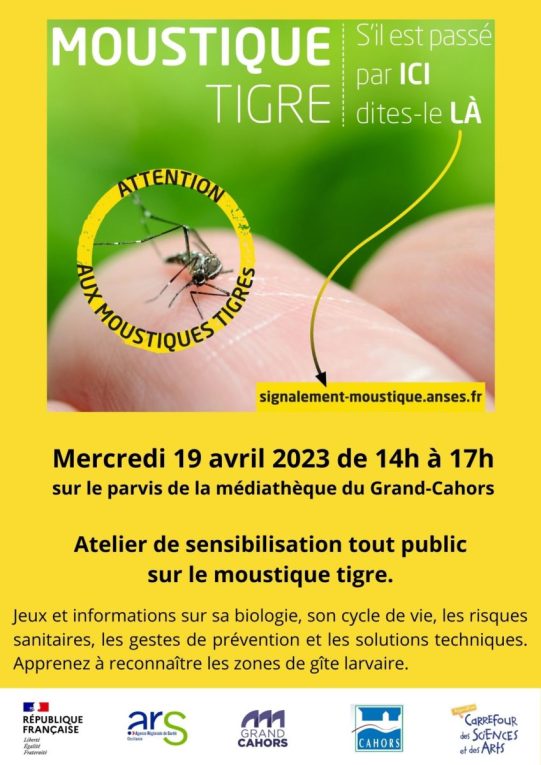 Sur Cahors, la mairie est très largement investie sur cette problématique. La mairie de Cahors et notre association vous invitent donc à un nouveau stand de prévention sur le moustique tigre, le mercredi 19 avril 2023 de 14h à 17h sur le parvis de la médiathèque du Grand-Cahors.