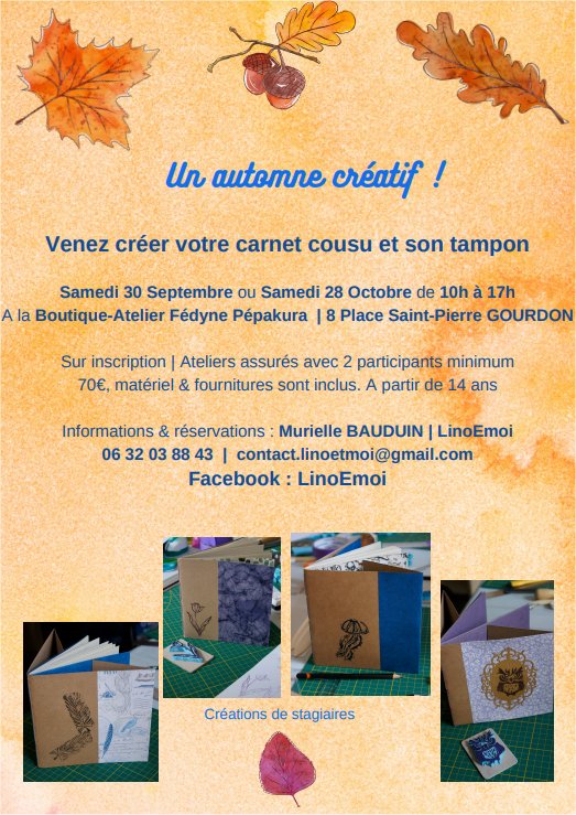 LinoEmoi c’est la réalisation de carnets reliure japonaise et confection de tampon, que vous pouvez retrouver dans mon espace atelier au 8 place St Pierre pour un stage d’une journée le 30 septembre ou le 28 octobre, voir inscription et détail sur le flyer.