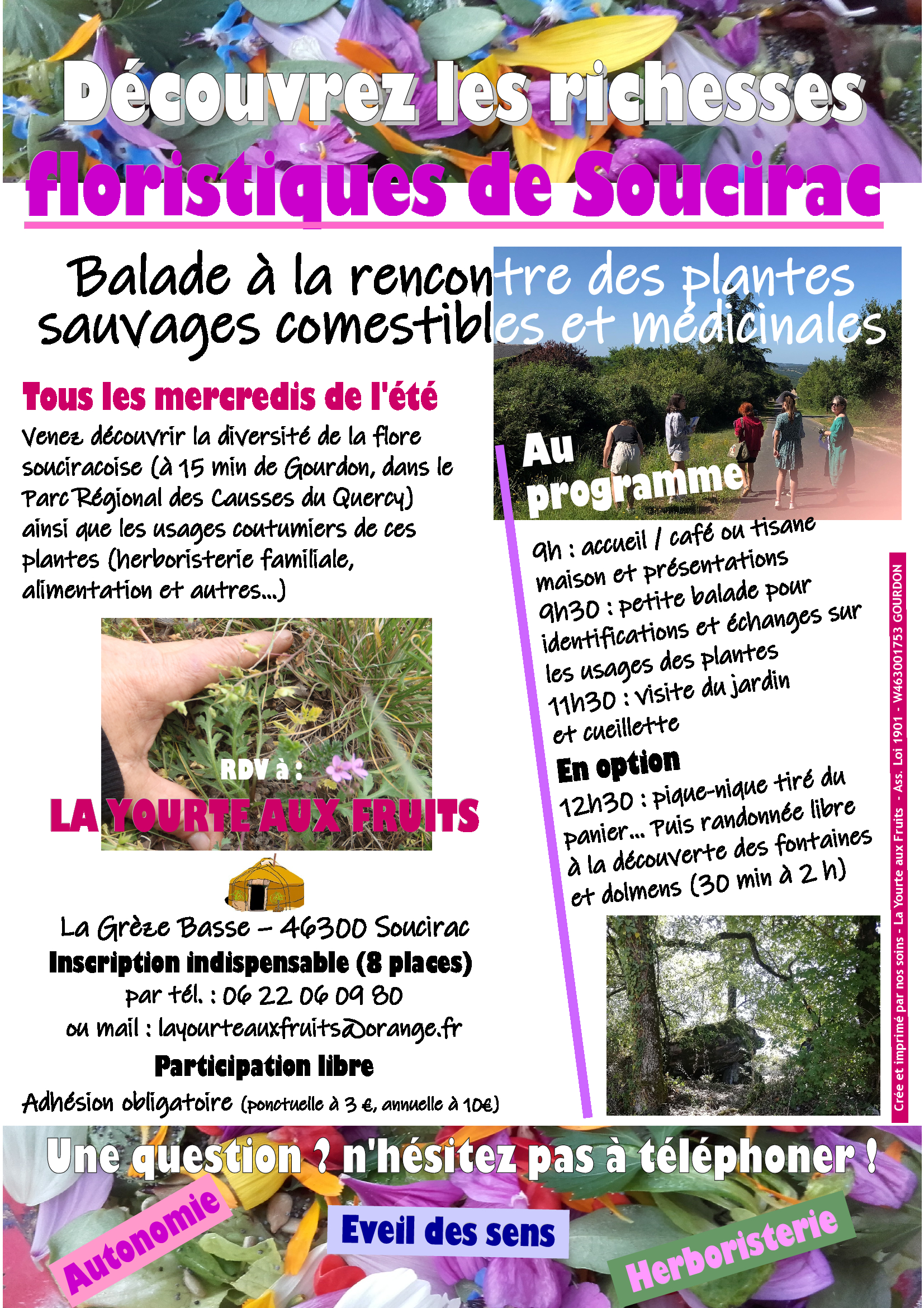 Continuer la lectureTous les mercredis jusqu’au 16 septembre inclus, la Yourte aux Fruits vous invite à découvrir les vertus ou les dangers des plantes de nos petits sentiers. Aromatiques