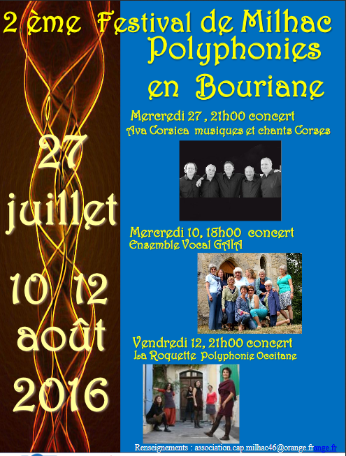 En 2015, nous avons créé le 1er Festival de Milhac « Polyphonies en Bouriane » qui a reçu l’accueil chaleureux d’un public conquis. La réussite et la convivialité de cet évènement nous incite à relever le défi en 2016 pour que cette aventure insuffle un regain d’animation régionale autour du chant traditionnel. Le 2ème Festival « Polyphonies en Bouriane » se produira du 27juillet au 12 août 2016, dans le Chœur de l’église de Notre-Dame de Milhac :