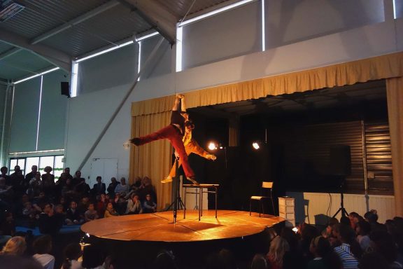 C’est sous les yeux ébahis des plus petits surpris par les chutes et les voltiges des acrobates qu’a eu lieu le spectacle de Corps de bois ce dimanche. Deux niveaux de lecture subtilement interprétés étaient présents dans cette mise en scène ; pour les adultes, on pouvait y décoder comment trouver la force de se relever après être tombé.