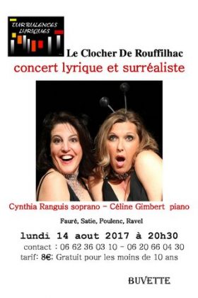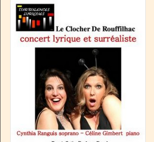 La chanteuse Cynthia Ranguis et la pianiste Céline Gimbert , des Turbulences Lyriques, vous attendent pour un concert surréaliste, à l’église de Rouffilhac!