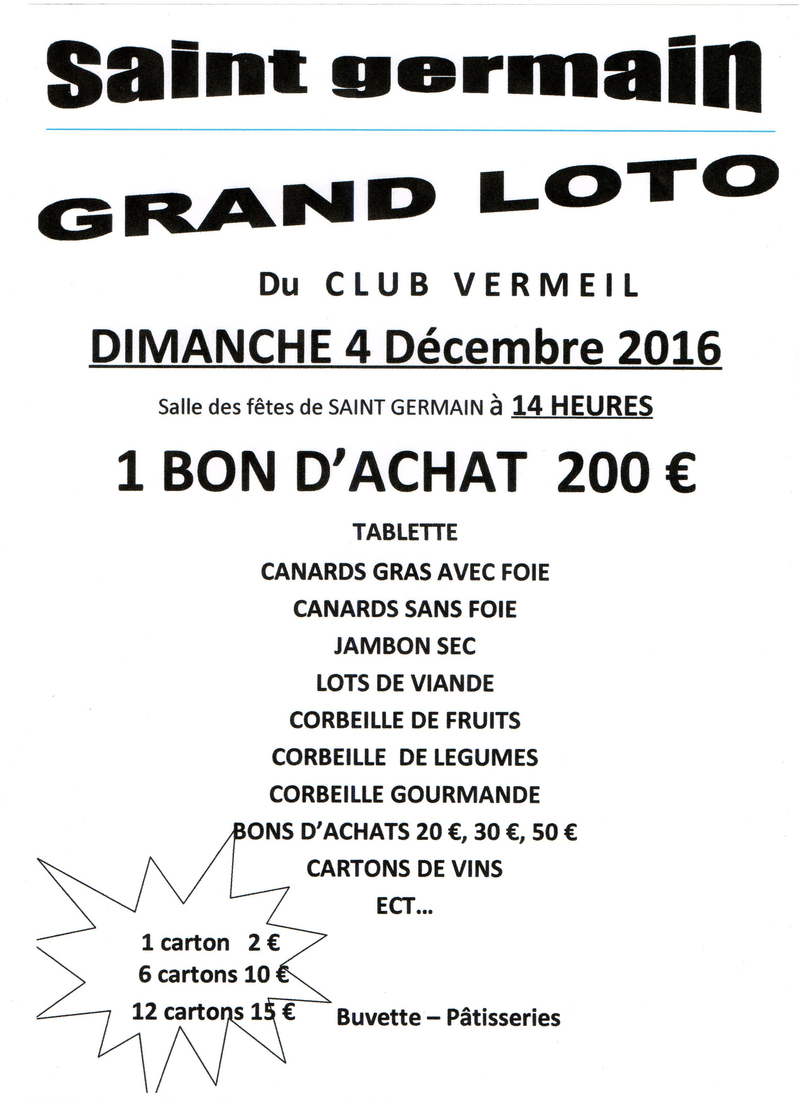 .Le club Vermeil de Saint Germain du Bel Air vous invite à son grand LOTO annuel.