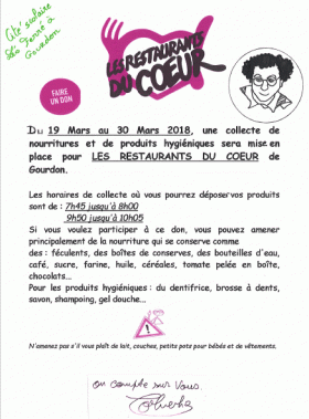 Les collégiens et lycéens de Gourdon organisent au profit des Restos du Coeur une collecte dans l’enceinte de la cité scolaire, du 19 au 30 Mars..Une magnifique leçon de générosité et d’altruisme !