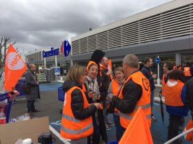 « Sans social, pas de commercial ». Une soixantaine de salariés syndiqués CFDT de Carrefour Cahors a manifesté ce samedi 31 mars devant le magasin de 11 h à 13 h. Ils ont scandé des slogans, et distribué des tracts aux clients. Jocelyne Andries, représentante CFDT Carrefour Cahors, est revenue sur les raisons de la grève : « Nous menons aujourd’hui un mouvement de grève pour exprimer notre mécontentement sur plusieurs points que Carrefour veut mettre en place. Notre magasin ainsi que 4 autres passent en location gérance. nous garderons l’enseigne, le repreneur rendra des comptes à Carrefour, mais nous, salariés, perdrons une partie de nos avantages. Un pack social doit être signé entre les instances syndicales et nos dirigeants mais à ce jour rien n’est fait. Nous n’avons aucune information sur nos conditions de reprise. Nous sommes tous très inquiets pour notre avenir. Nous pouvons, pour certains, perdre jusqu’à deux mois de rémunération. Notre prime de participation est en chute libre. Elle a été, cette année, divisée par 10 par rapport à l’année dernière. Au travers de cette action, nous voulons rappeler à nos dirigeants que sans social, pas de commercial. » « On veut sensibiliser la clientèle à notre combat » a souligné Marie Simon, secrétaire générale de la CFDT