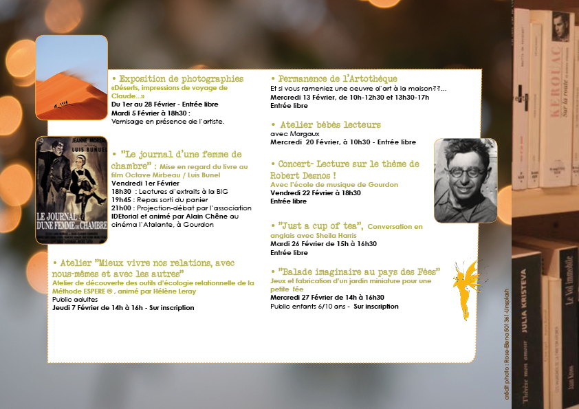 Réouverture de la Bibliothèque de Gourdon après un mois de fermeture avec son lot de nouveautés (BD, romans, documentaires, albums….) et le programme du mois de février.