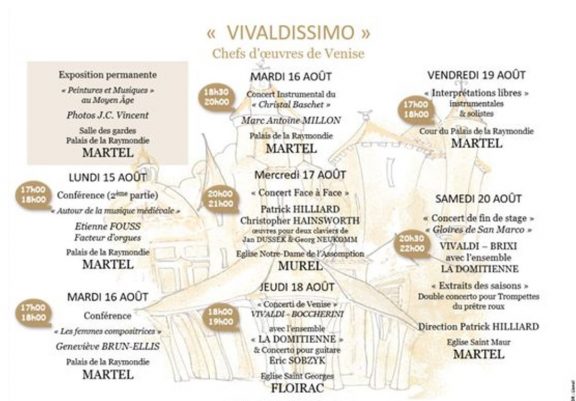 Ce « 7e festival de musique baroque » a pour thème VIVALDISSIMO, chefs d’oeuvre de Venise et propose : stage, conférences, exposition et concerts.