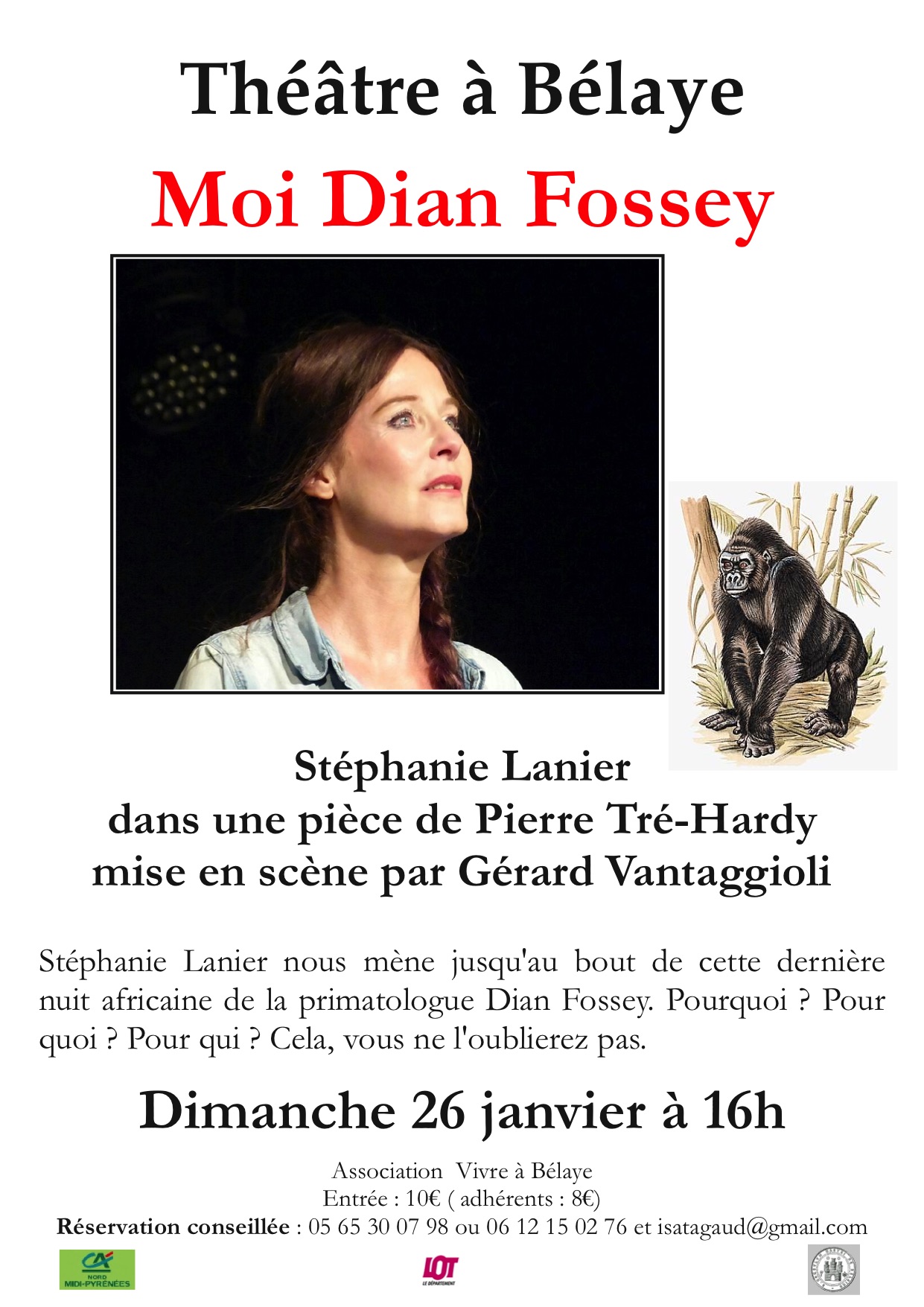 Le dimanche 26 janvier à 16h, à la salle des fêtes de Bélaye, l’association « Vivre à Bélaye » propose une prestation à ne pas manquer:  « Moi, Dian Fossey », un spectacle dans lequel une excellente comédienne, Stéphanie Lanier, incarne la primatologue Dian Fossey une éthologue américaine, spécialisée dans l’étude du comportement des gorilles. Elle les étudie régulièrement dans les forêts de montagne du Rwanda. Cet engagement lui coûtera la vie. Elle est assassinée en 1985. Son assassin est toujours inconnu à ce jour. Son livre best-seller Gorilles dans la brume est une référence pour la presse et le public. La performance de cette actrice, seule en scène, est extraordinaire : elle nous mène par le cœur jusqu’au bout ce cette nuit africaine, nous côtoyons les gorilles, nous sommes happés par cette aventure hors normes et émus par l’évocation des relations qui se tissent entre ces animaux et cette femme passionnée par ses recherches. Un très beau moment de théâtre.