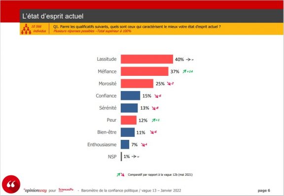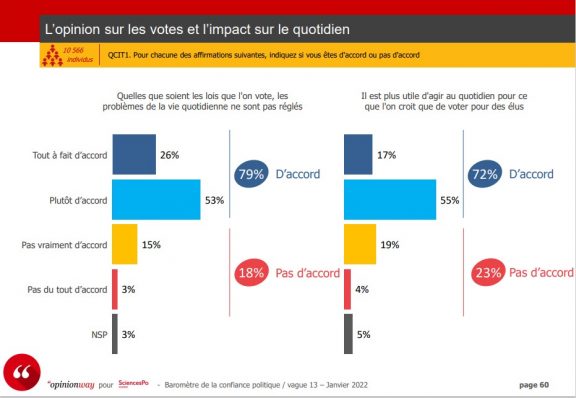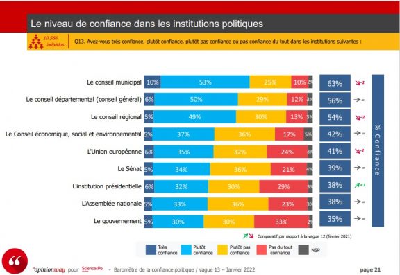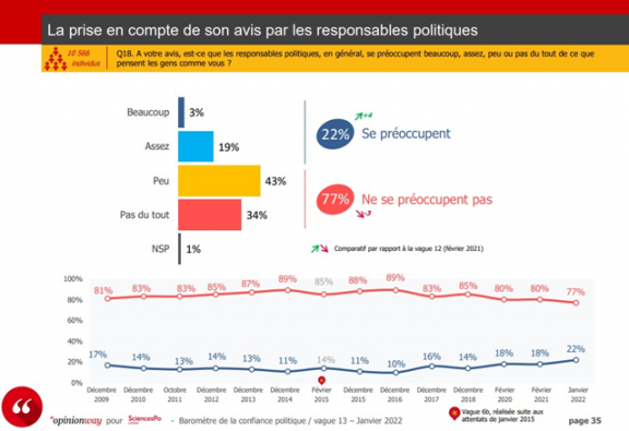 Le baromètre de la confiance politique réalisé par le CEVIPOF de janvier 2022 est parlant.