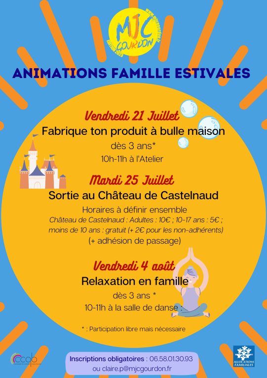 Renseignements, Réservations : 06.58.01.30.93 ; claire.p@mjcgourdon.fr