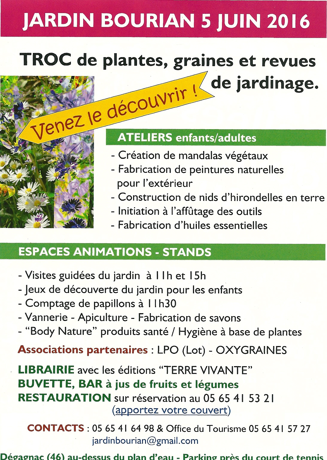 C’est la fête et à cette occasion le Jardin ouvre ses allées. Des artisans viennent montrer leur savoir-faire, des ateliers enfants et adultes pour s’initier à diverses techniques, des visites guidées du jardin… Comme chaque année chacun peut venir gratuitement troquer ses plantes…D’autres stands aussi autour de la nature : librairie, produits à base de plantes. Buvette, bar à jus et restauration sur place… De quoi passer une belle journée en plein air…