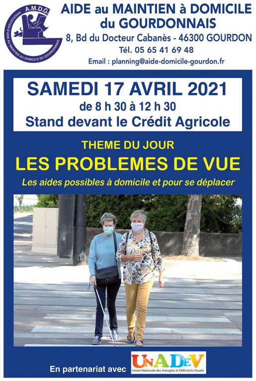 Dans le cadre d’un partenariat avec l’UNADEV, association nationale qui accompagne les personnes déficientes visuelles, l’AMDG Gourdon vous présentera les différents problèmes de vue détectables mais aussi les aides possibles à domicile pour ces personnes. En effet, l’AMDG Gourdon est la seule association de Gourdon à être conventionnée avec l’UNADEV, ce qui lui permet d’assurer un service de qualité à domicile auprès des personnes déficientes visuelles mais aussi de toute personne… le meilleur accueil vous sera réservé.