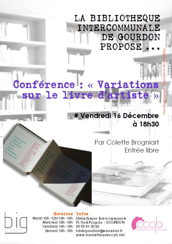 Animations à la BIG Publié le jeudi, 15 décembre 2016jeudi, 15 décembre 2016 par Bibliothèque Intercommunale Gourdon Conférence : variations sur un livre d’artiste par Colette Brogniart à la Bibliothèque de Gourdon. Entrée libre. 18h30 .