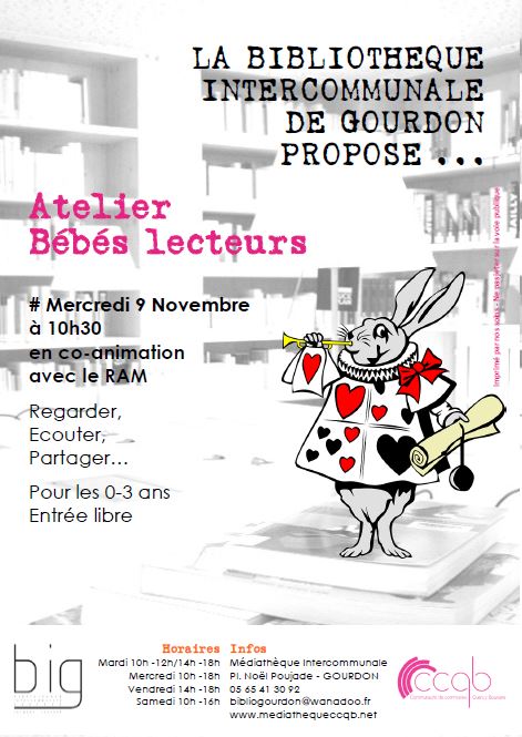Animations à la BIG Publié le vendredi, 4 novembre 2016vendredi, 4 novembre 2016 par Bibliothèque Intercommunale Gourdon .Mercredi 9 novembre, la Bibliothèque de Gourdon vous propose le matin à 10h30 un atelier « Bébés lecteurs » avec la complicité du Relais d’Assistantes Maternelles (RAM) et à partir de 12h30 une « Sieste littéraire amoureuse ». Entrée libre .