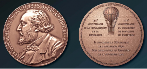 Cinq associations (Amicale des Anciens Élèves du Lycée et du Collège Gambetta, Association des Collectionneurs Lotois, Association sur l’Histoire des Familles, Société des Études du Lot et Université pour Tous Cahors) commémorent cet anniversaire en frappant une médaille avec le portrait gravé en mars 1882 par Jules Chaplain et approuvé par Léon Gambetta lui-même peu avant sa mort.