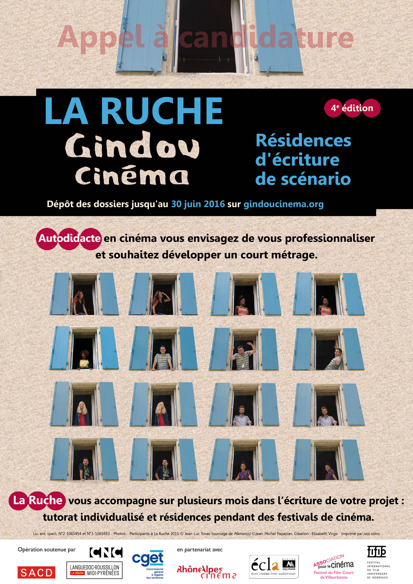 Gindou Cinéma lance la 4e édition de La Ruche – programme d’accompagnement dans l’écriture de scénario de court-métrage par le biais d’un tutorat individualisé et de résidences d’écriture organisées pendant des festivals de cinéma. Il est destiné à des personnes âgées de 20 à 30 ans qui n’ont ni formation ni expérience significative dans le cinéma. L’appel est national et 8 candidats seront retenus. Le dossier de candidature est à remplir avant le 30 juin 2016 sur www.gindoucinema.org.