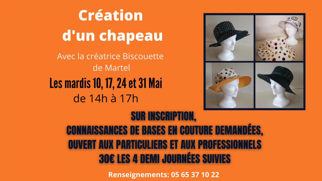 La créatrice Biscouette interviendra au FABLAB de Gourdon les 10,17,24 et 31 mai de 14h à 17h pour vous donner les bases de couture d’un chapeau d’été.