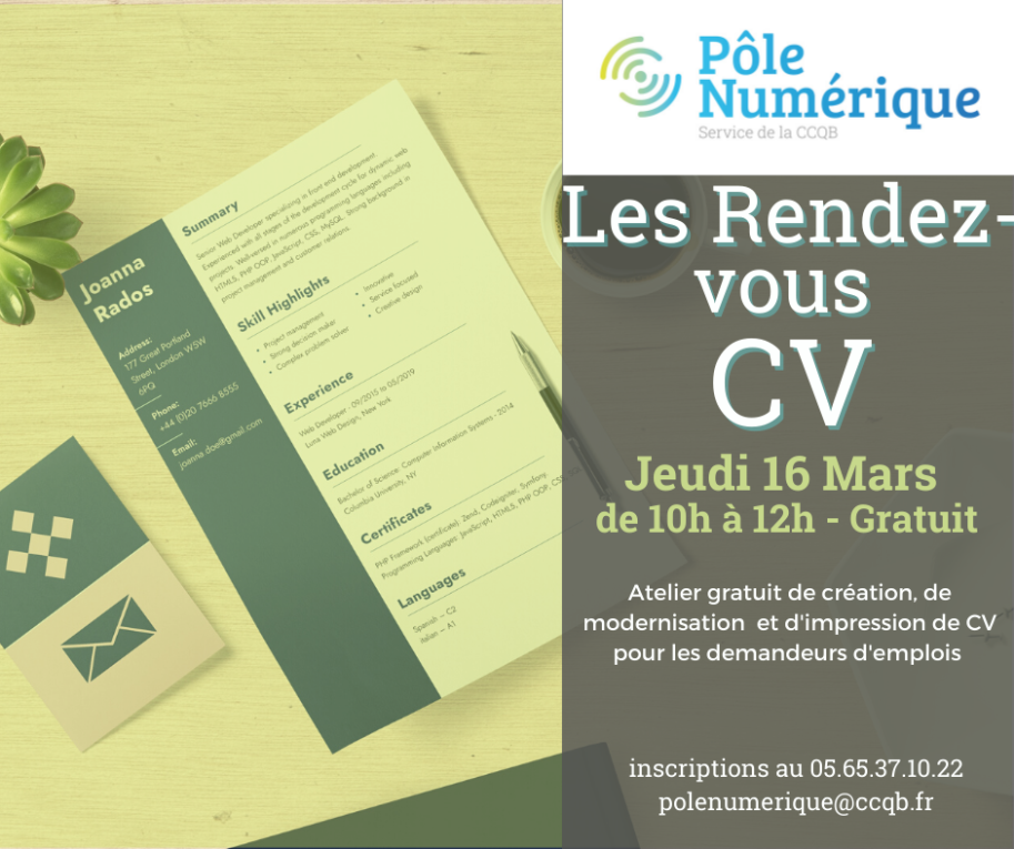 Atelier gratuit de création et d’impression de CV pour les demandeurs d’emplois afin de les accompagner dans la mise en forme et la découverte d’outils en ligne (CVDesignR) pour la réalisation de CV modernes et professionnels. (Pensez à vos identifiants Pôle emploi/mail/clefs Usb…)