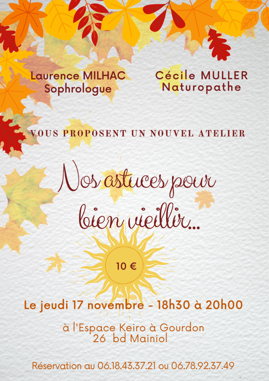 Lors de cet atelier, se mêleront des informations, conseils et remèdes naturels, par Cécile MULLER, naturopathe, pour accompagner les désagréments liés à l’âge ainsi que des pratiques de sophrologie, délivrées par Laurence MILHAC, sophrologue, qui viendront renforcer notre équilibre physique et émotionnel …