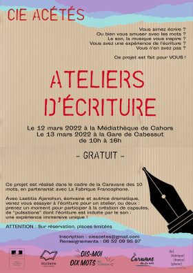 En partenariat avec La Fabrique Francophone, Fabrique de territoire implantée à Cahors, des ateliers d’écriture sont organisés lors de son accueil en résidence à Cahors.