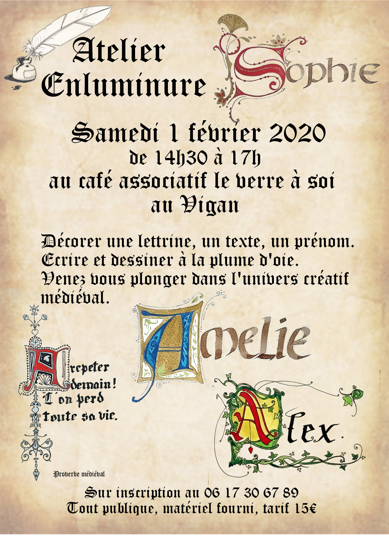 Samedi 1 février venez participer à un atelier enluminure au café associatif du Vigan. Je vous propose de venir essayer l’écriture à la plume, au calam, créer une lettrine à partir d’un model ou selon votre imagination, la décorer et mettre en valeur un mot, un prénom, une citation…Aucune connaissance n’est nécessaire, simplement l’envie de créer et de passer un bon moment!