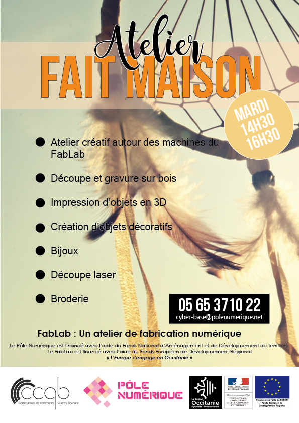 L’Atelier Fait Maison est un atelier « grand public », dédié à des réalisations sur les machines du FabLab (brodeuse numérique, découpe laser, gravure, imprimante 3D…)