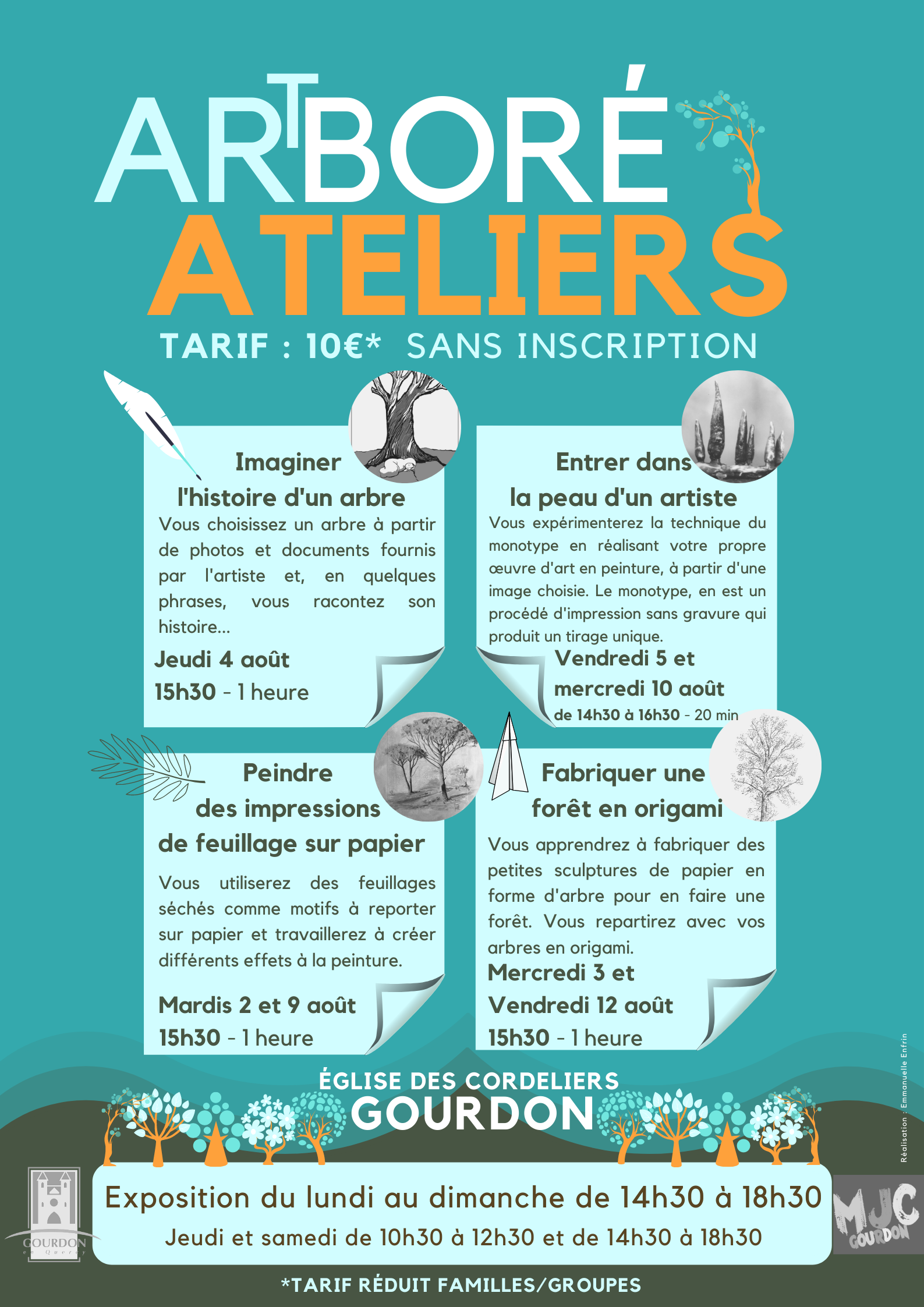 Autres ateliers de la semaine : jeudi 4 août 15h30 : « imaginer l’histoire d’un arbre » et vendredi 5 août 14h30-16h30: « entrer dans la peau d’un artiste ».