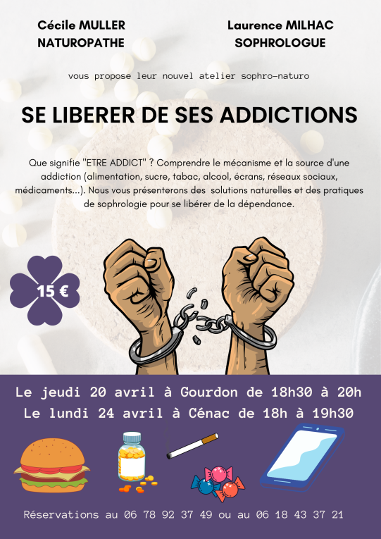 Cet atelier co-animé par Laurence MILHAC, sophrologue et moi même, Cécile MULLER, naturopathe, permettra de comprendre le mécanisme et la source d’une addiction (alimentation, sucre, tabac, alcool, écrans, réseaux sociaux, médicaments…). Nous vous présenterons des solutions naturelles et des pratiques de sophrologie pour se libérer de la dépendance.