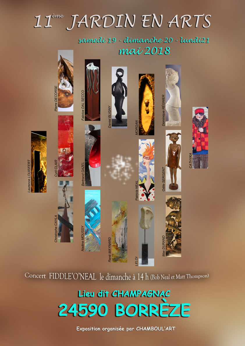 Les 19, 20 et 21 MAI 2018 à Champagnac 24590 BORREZE Cette exposition présente 16 artistes, peintres et sculpteurs, à
