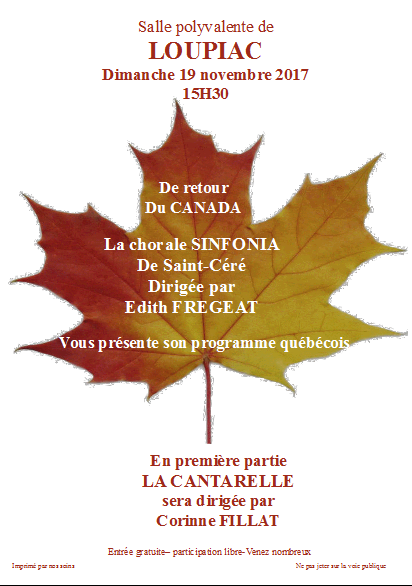 Continuer la lectureLe dimanche 19 novembre à 15h30 dans la salle polyvalente de Loupiac, concert de « La Cantarelle » dirigée par Corinne Fillat