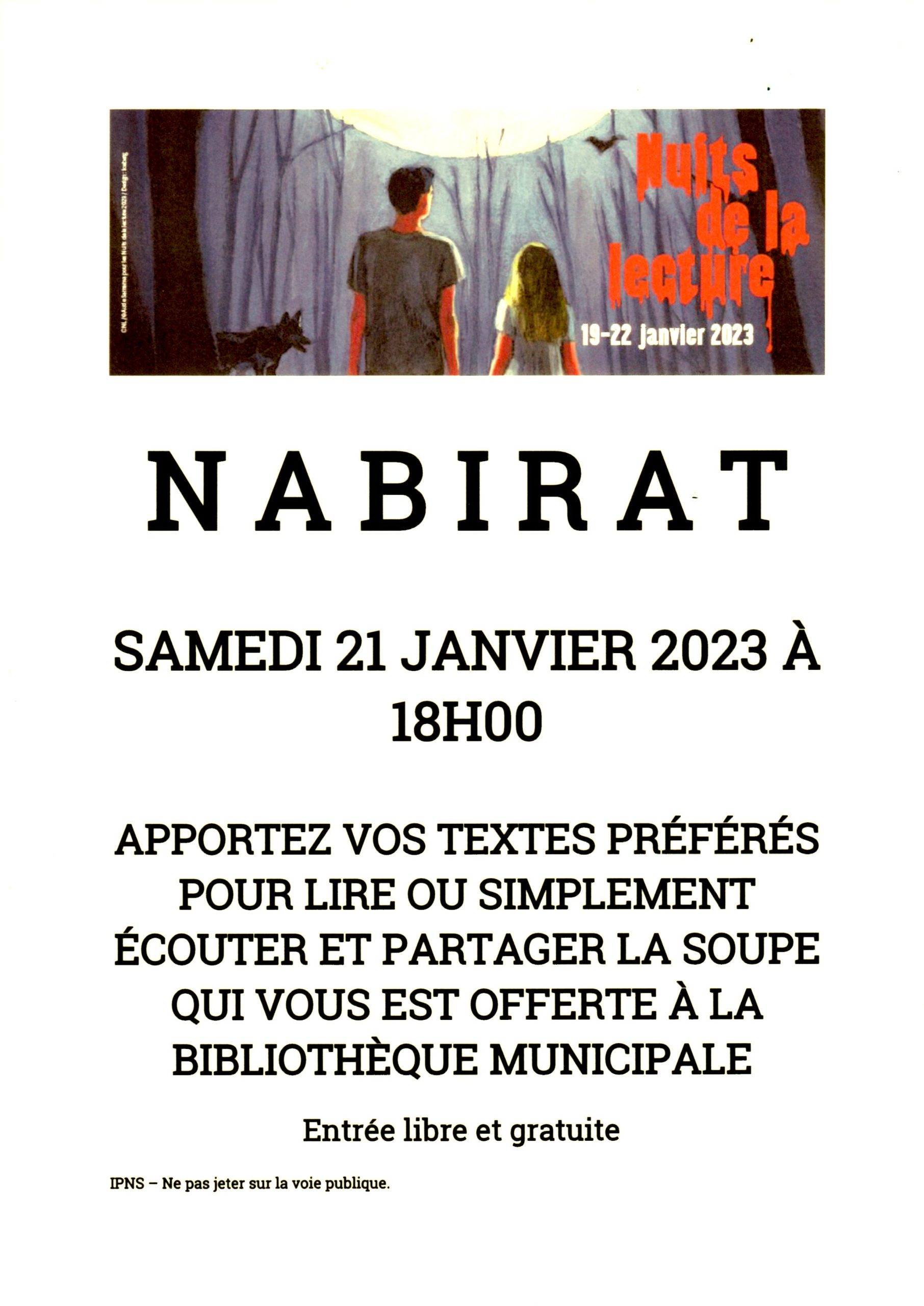 le samedi 25 janvier à 18h00, la bibliothèque municipale de nabirat participera aux neuvièmes nuits de la lecture, événement organisé