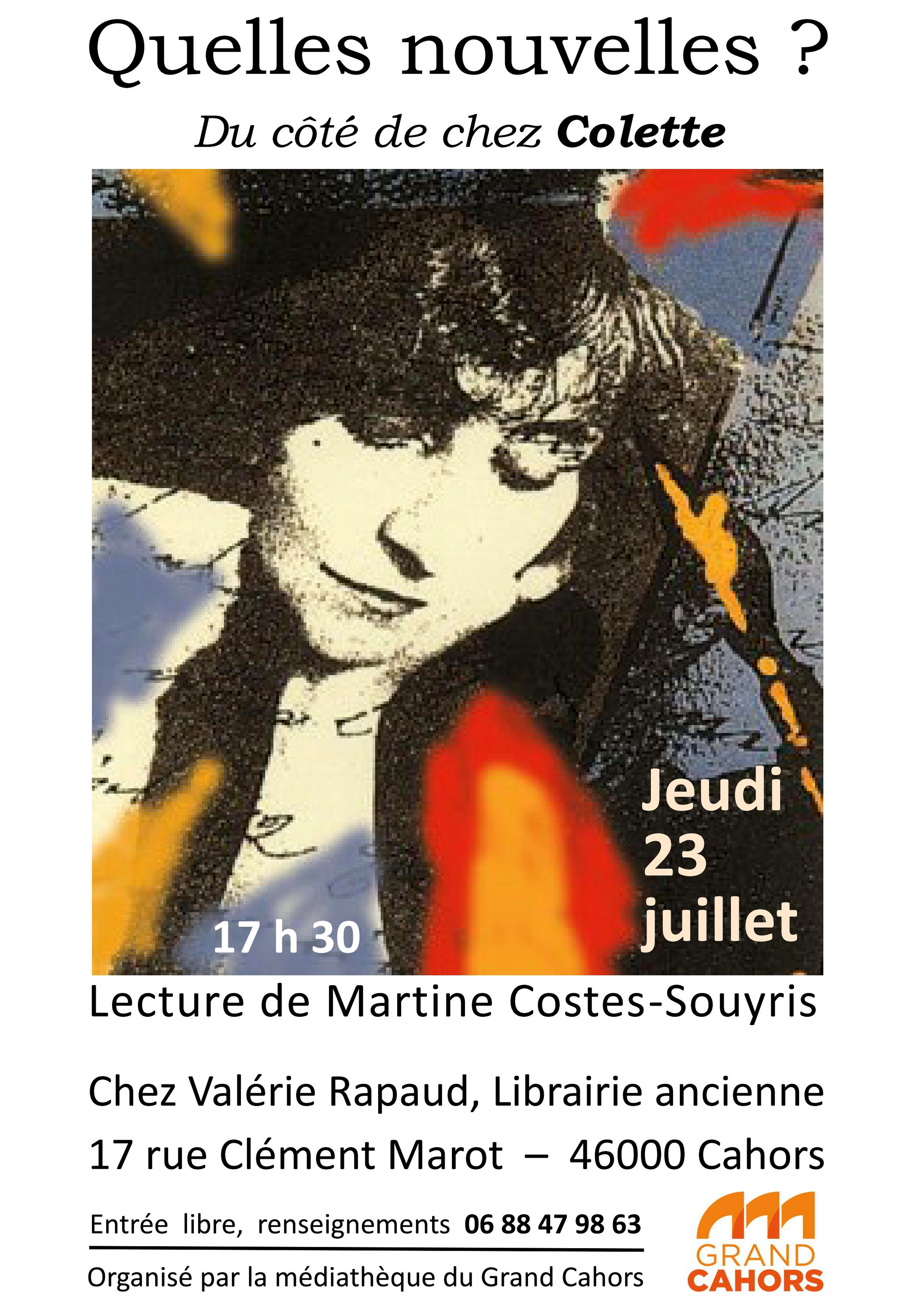 Continuer la lectureUne lecture de Martine Costes Souyris Jeudi 23 juillet de 17h30 à 18h Devant la librairie ancienne Valérie Rapaud, 17
