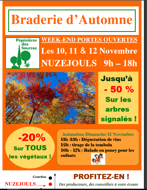 Continuer la lectureLes Pépinières des Sources de Nuzejouls ont le plaisir de vous accueillir le Samedi 11 et Dimanche 12 Novembre à