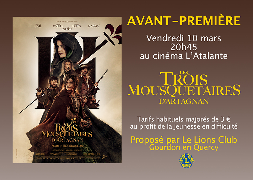 Le Lions Club de Gourdon a le grand plaisir de présenter une avant-première exceptionnelle du film Les Trois Mousquetaires : D’Artagnan. Réalisé par Martin Bourboulon, cette adaptation est complètement fidèle au célèbre roman d’Alexandre Dumas. Le casting 5 étoiles inclut François Civil (D’Artagnan), Vincent Cassel (Athos), Romain Duris (Aramis), Pio Marmaï (Athos) et Eva Green (Milady). Cette production a nécessité 150 jours de tournage, 100% en France, 94% en décors naturels.