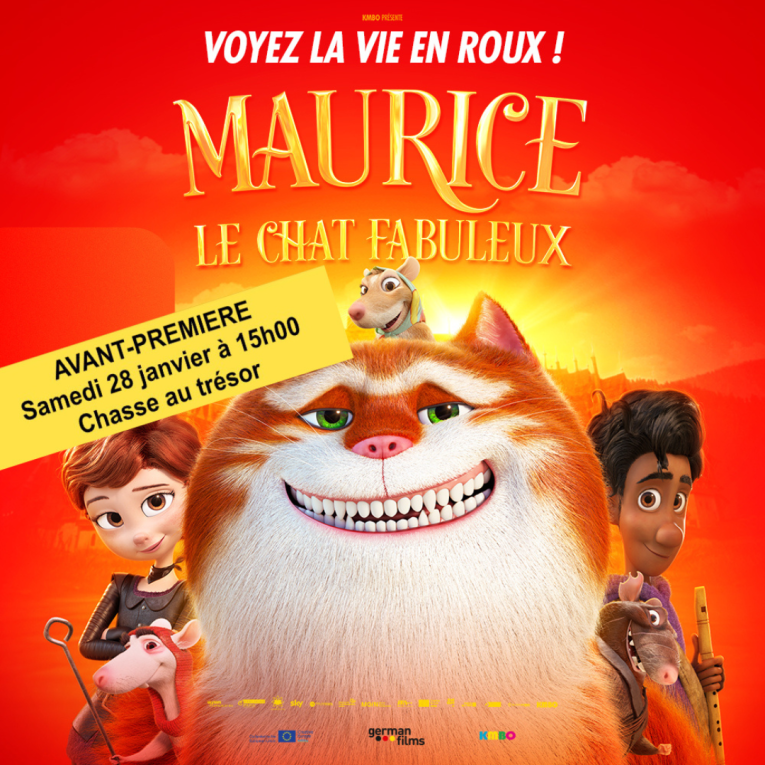 Samedi 28 janvier à 15h00, une belle après-midi en famille au cinéma Louis Malle avec le film Maurice, le chat fabuleux suivi d’une chasse au trésor et un goûter offert, ainsi que des goodies pour tous !!!