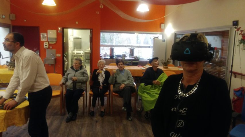L’EHPAD de Salviac accueille des résidents qui sont pour la plupart statiques et de fait n’ont plus accès à des activités culturelles telles que les visites de musées et n’ont parfois plus le loisir de pouvoir se promener en ville ou dans la nature. La réalité virtuelle peut combler ce vide. La réalité virtuelle leur offre des « voyages immobiles ». Par l’utilisation de casques VR et écouteurs ces personnes peuvent « vivre » ou « revivre » des expériences sensorielles, des visites de lieux, des promenades dans des espaces naturels ou simplement prendre part à des jeux qui leur feront faire des exercices physiques adaptés à chaque cas. Les émotions que ces personnes peuvent ressentir sont palpables, visibles, ou même émouvantes. L’image, le sonore et l’environnement sont de telle qualité que la frontière entre le réel et le virtuel est très mince. Le lien entre les deux mondes s’articule autour des objets qui peuvent être sculptés avec les outils de réalité virtuelle et qui peuvent ensuite être imprimés en 3D. Cette animation était proposée par l’animatrice de l’EHPAD et Pascal Pichoutou du village voisin de Cazals où il tient un magasin dédié à cet univers.