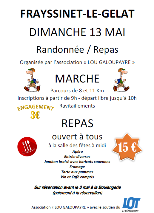 L’association de marche “Lou Galoupayre” organise une marche autour de Frayssinet-Le-Gélat, le dimanche 13 mai à partir de 9 h suivi d’un repas à la salle des fêtes. Rendez-vous devant la mairie.