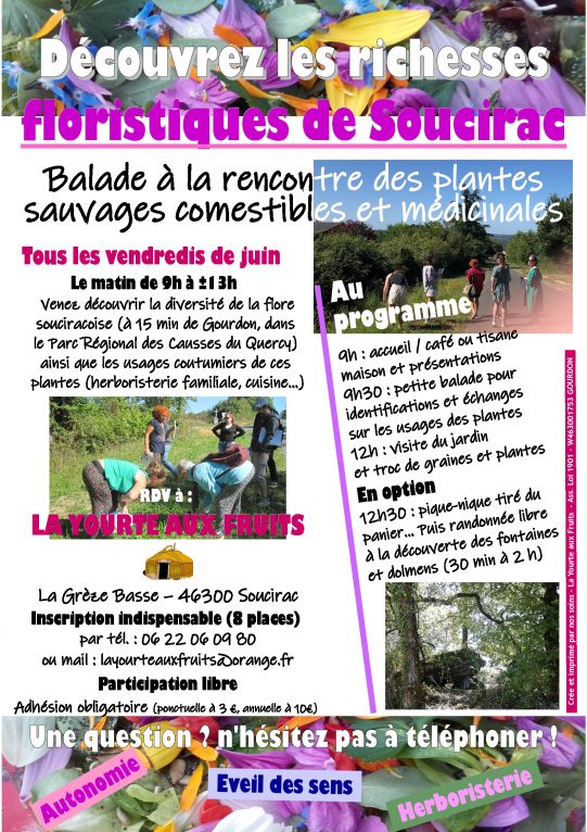 Accueil et dégustation à 9 h – présentation de l’herboristerie familiale puis balade d’identification botanique et échanges sur les usages, vertus et dangers de nos plantes sauvages…