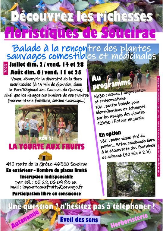 Venez découvrir l’incroyable biodiversité de la flore Souciracoise… A 15 minutes de Gourdon, dans le Parc régional des Causses du Quercy. Cette balade floristique se déroule en toute convivialité après une petite dégustation et une présentation de l’herboristerie et de la cueillette, nous échangeons sur les vertus et dangers des nombreuses plantes, comestibles et médicinales mais aussi toxiques qui jalonnent notre parcours.