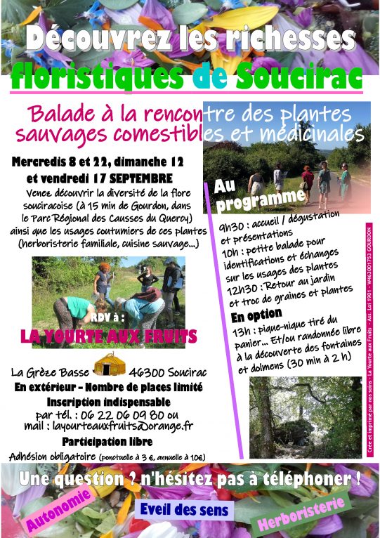 A 15 minutes de Gourdon, dans le Parc régional des Causses du Quercy. Cette balade floristique se déroule en toute convivialité après une petite dégustation et une présentation de l’herboristerie et de la cueillette, nous échangeons sur les vertus et dangers des nombreuses plantes comestibles et médicinales (ou  non) qui jalonnent notre parcours.