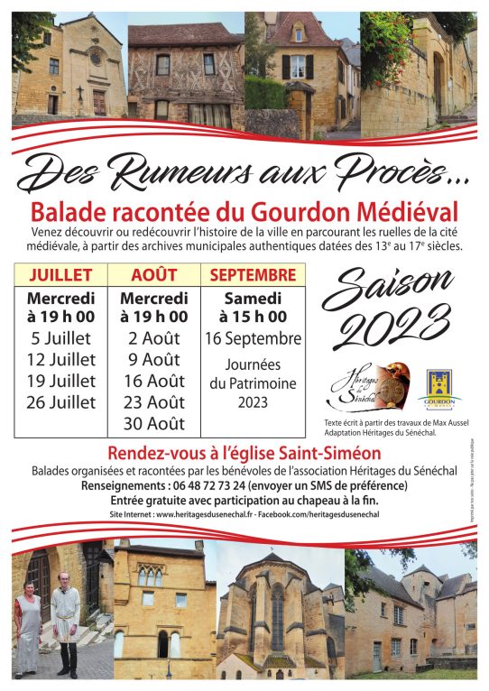 À Gourdon, les représentations auront lieu les mercredis de juillet et août à 19 h, en partant de l’église Saint-Siméon. Vous pourrez notamment y apprendre l’histoire du faubourg Saint-Siméon, de la fondation du prieuré du Mont-Saint-Jean, du passage d’un inquisiteur en 1241 et de la prise de Gourdon par une armée protestante lors des Guerres de Religion.