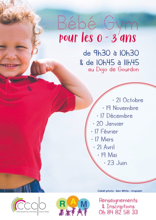 Le RAM de Gourdon propose tous les mois au Dojo de Gourdon, 2 séances de Bébé gym (de 9h30 à 10h30 et de 10h45 à 11h45), pour les 0-3 ans.