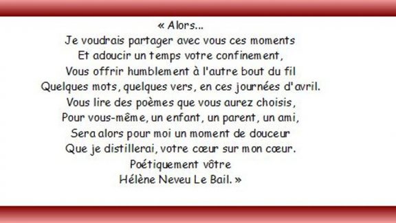« Cette période de confinement nous invite à imaginer de nouvelles formes de médiation pour rester en contact avec vous tous, que vous fréquentiez la bibliothèque ou non. C’est pourquoi, la mairie de Gramat et l’équipe de la bibliothèque, Corinne, Hélène et Marie, ont imaginé une façon poétique de rester en lien les uns avec les autres grâce au pouvoir des mots. Nous vous proposons d’offrir un poème téléphoné à une personne de votre choix. Une façon de rompre un peu l’isolement pour les personnes les plus esseulées et d’amener un peu d’originalité dans nos quotidiens, de faire sourire les uns et d’émouvoir les autres. Comment cela va-t-il se passer ? Vous envoyez un mail à bibliotheque@gramat.fr dans lequel vous déclinerez votre identité donnerez le nom, prénom de la personne à contacter ainsi que son numéro de téléphone en ajoutant le lien qui vous unit (famille, collègue, ami(e), voisin(e)…). Les inscriptions auront lieu du lundi au mercredi pour diffusion le vendredi.