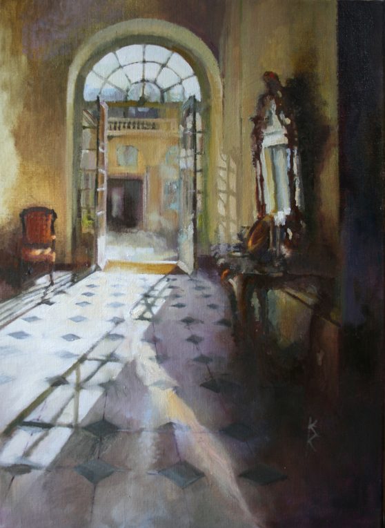 Karina Knight s’inspire des effets de la lumière dans un intérieur, directe et indirecte sur l’espace, les matériaux et les objets. Il en résulte un sens saisissant de la perspective, de la composition et de la nuance des couleurs.  A distance, son travail est réaliste, plus proche il est moderne et s’oriente vers l’abstraction. Dans ses œuvres, il y a une prise de conscience de l’histoire  et aussi de quelque chose qui vient de se passer ou qui est sur le point de se passer dans l’intérieur représenté. La vie est un mystère à éclaircir.