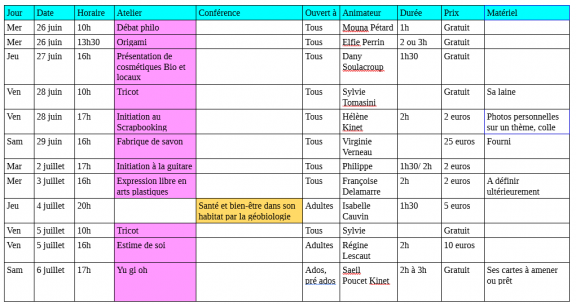 Les ateliers seront annoncés régulièrement mais voici la liste des ateliers pour deux semaines: