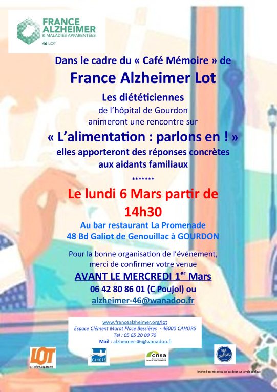 Manger mieux, manger sain, réveiller la gourmandise de nos aînés : les diététiciennes de l’hôpital de GOURDON animeront une rencontre dans le cadre du café mémoire au bar/restaurant de la promenade, le lundi 6 Mars à partir de 14h30.