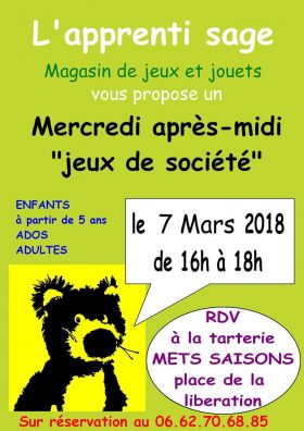 .L’apprenti sage et la Tarterie Mets Saisons à Cahors Place de la Libération , vous proposent pour le 7 mars une demie journée  » jeux de société  » pour les enfants à partir de 5 ans, ce magasin de jouets situé Rue Portail Alban vous permettra de  découvrir des jeux originaux et nouveaux.