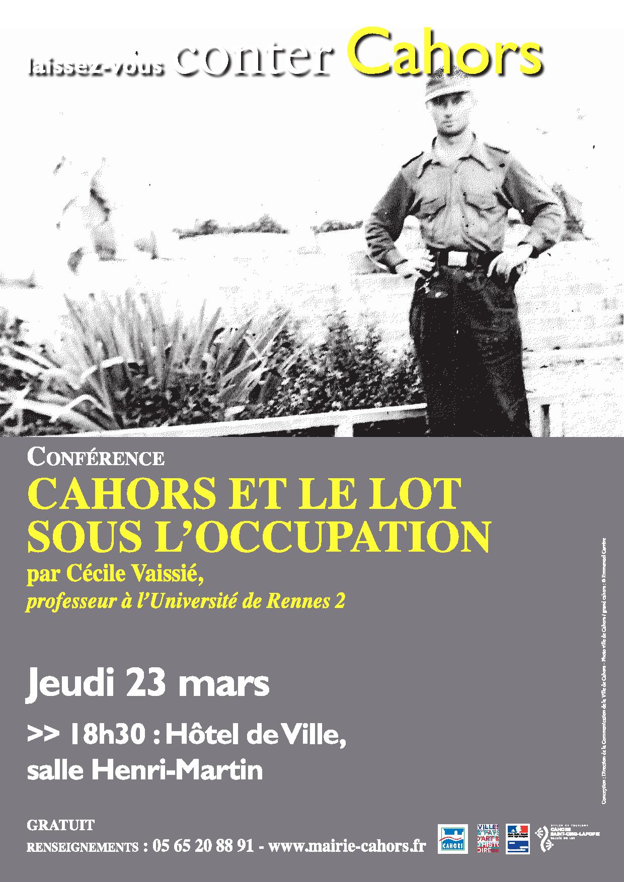 Le service du patrimoine organise une conférence le 23 mars à 18 h 30, salle Henri-Martin.Elle sera animée par Cécile Vaissié, professeur à l’Université de Rennes 2. Elle a publié un ouvrage sur Cahors et le Lot sous l’Occupation. Véritable travail d’histoire, il se fonde sur de nombreux documents d’archives et des témoignages. Cécile Vaissié est fille et petite fille de résistants lotois. Quelques objets et documents originaux en lien avec la guerre à Cahors illustreront la conférence de Cécile Vaissié. L’entrée est libre.