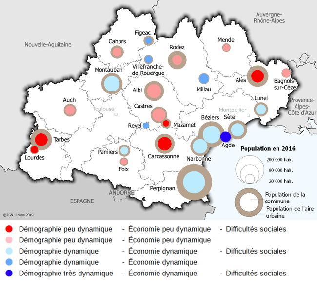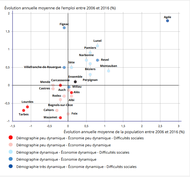 Les 25 communes d’Occitanie retenues au titre du programme Action Cœur de ville présentent des disparités importantes, démographiques, géographiques, sociales, économiques.Cahors a une démographie et une économie peu dynamique contrairement à Figeac. Cependant l’emploi progresse sensiblement en périphérie à Cahors.
